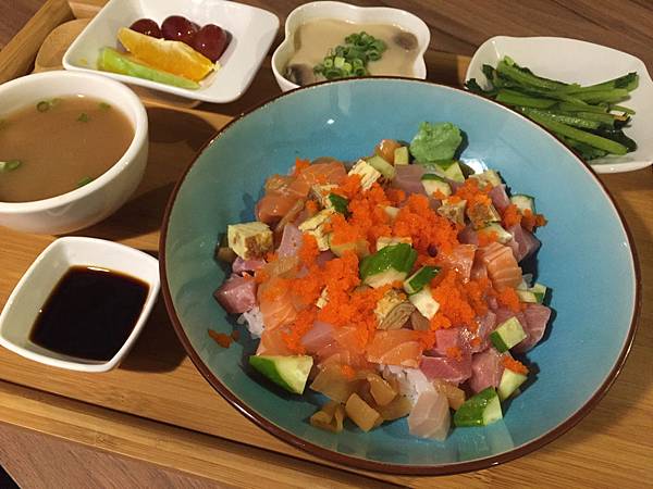 散壽司丼,用基本生魚片組合加些黃瓜切丁及蝦卵,這非常對我的味,其他的小菜搭配的也頗具心思蠻均衡的。但當時餐送來時湯有些涼了就是。