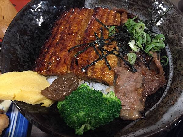 蠻牛燒肉定 380元, 這是另外單點來試試吃不完打包的,ㄧ片鰻魚加四片牛肉為主,鰻魚依然表現不錯,但牛肉則平平,總覺得份量也是可以再稍稍加強應付食量大的人的報怨。