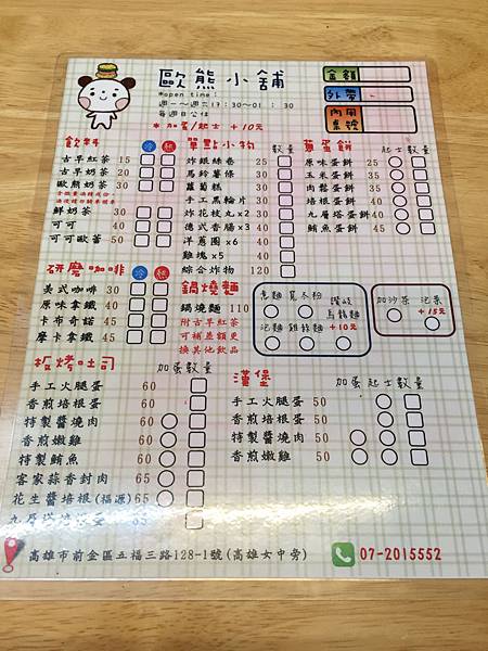 幾次在朋友臉書動態或電視節目或夜晚經過雄女時都會看見的一間消夜店,這也算高雄一窩蜂熱壓宵夜新竄起店家之一,其實本人不太愛這類型的宵夜店,感覺大同小異,但看各家生意似乎都不錯於是就心血來潮的選擇了這間歐熊小舖,實在是因為他們的壓吐司的外觀效果我比較滿意,沒有硬硬的邊,所以就所謂的慕名前來走踏消費。