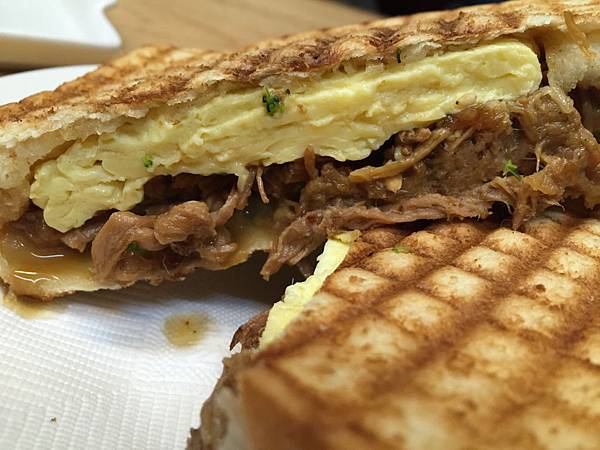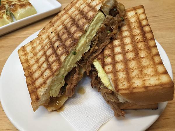客家蒜香封肉板烤吐司 65元 + 蛋 10元 這道餐點算今日來品嚐的重點之一,節目上所播報的是採用老闆自身的客家料理--客家封肉,一直好奇是怎樣的口感,近期很多熱壓吐司的產品都會想ㄧ些創舉來做產品,可個人認為吐司能搭配的有限,並非每樣料理都可以搭入土司料理內的,尤其熱壓這方式,客家封肉入吐司入吐司尚屬可接受但沒太大驚艷,不過加蛋的蛋卻讓我有喜愛到,並非我所想的荷包蛋,這樣的做法在視覺效果來看是不錯的,有把整份吐司撐起飽滿的感覺,但封肉當日給我的部分太油,可惜了。